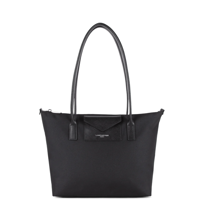 Tote bag "516-30 SMART KBA" of the brand Lancaster, designed for shopping, leisure and outings. This nylon and polyamide bag features a flap pocket on the front, decorated with the logo "LANCASTER PARIS" in silver letters. Two sturdy handles are attached to the top of the bag for comfortable carrying on the shoulder or by hand. The textile lining adds a touch of comfort and durability. The black color is ideal for everyday use. This bag is perfect for storing your shopping items, fashion accessories or work documents. -
