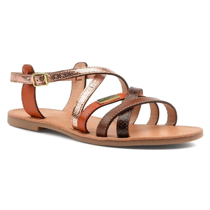 Discover the HAPAXGUM sandals, a unique creation of the brand Les Tropeziennes. This pair of flat sandals is made of quality leather, with a leather lining for maximum softness. The leather insole ensures optimal comfort, while the rubber outsole offers exceptional lightness and breathability. HAPAXGUM have a casual and summer style, perfect for holidays or sunny outings. The three wide bands that cover the foot offer a touch of fantasy: one is in gold-pink metallic leather with a textured pattern, the other is in smooth dark leather, and the third combines the two materials for a unique style. A small metal plate on one of the strips contains the brand information. A wide adjustable bandage with a gold buckle ensures a precise fit and optimal safety. HAPAXGUM are a pair of sandals that offer both elegance and functionality, ideal for everyday wear or for summer outings. -