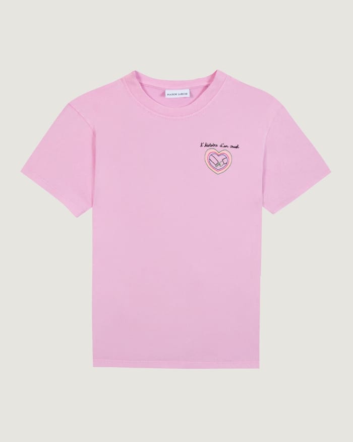 This T-shirt W's BAINVILLE CRUSH STORY from Maison Labiche combines elegance and simplicity for a casual everyday look. Designed in GOTS certified cotton, this short-sleeved model stands out for its soft pink hue, perfect for a style that is both fresh and timeless. Its classic crew neck fit ensures optimal comfort, while its breathability makes it an ideal ally for everyday activities, leisure or even work moments. Attention to detail can be found in the embroidered yoke on the left chest, where a stylized heart and cursive writing add a subtle and personal touch. Versatile and timeless, this T-shirt fits in both a casual outfit and a more structured package, while remaining true to the minimalist and comfortable spirit of the range. -