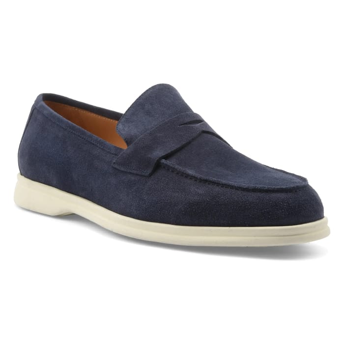 These classic Luca loafers from the Manovie Toscana brand combine timeless elegance with stylish comfort. Designed in navy suede, they embody a chic and formal style, perfect for the office as for evenings or events. Their velvet leather upper brings a soft, silky texture, while the leather lining and leather insole enhance their durability and comfort. The rubber sole, in a light beige tone, completes the whole with a discreet and timeless touch. The neat stitching details and velvet leather strap, typical of loafers, emphasize the craftsmanship and care brought to each piece. A versatile shoe, both elegant and practical, to sublimate each outfit with discretion and sophistication. -