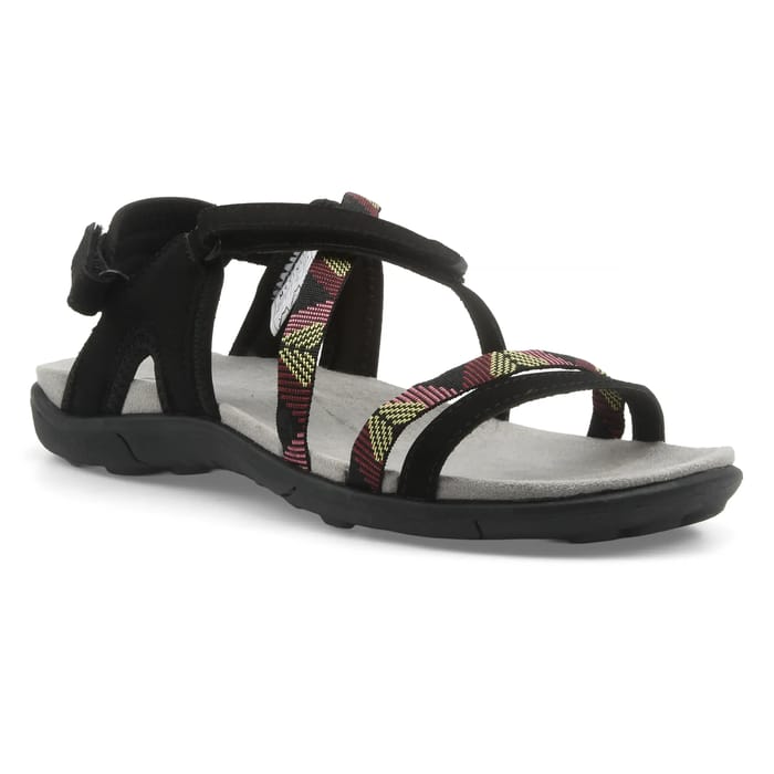 The AHTRA II W'S sandal from the McKinley brand combines casual style with optimal comfort to fit any summer occasion. Designed in a blend of synthetic and textile, this flat sandal stands out for its elegant yet practical design, perfect for beach, vacation or everyday use. The textile upper, lined for better support, naturally hugs the foot, while the textile insole brings a touch of softness and breathability. The rubber sole, sturdy and slightly textured, ensures lasting stability, ideal for long days in the sun. The precise fit is facilitated by a strap with loops adjustable around the reed, guaranteeing a firm hold without compromising comfort. Although soberly elegant in its black color, this sandal is adorned with colorful details with patterns woven in shades of pink, yellow, green and red on some straps, adding a vibrant and modern touch to its minimalist look. Light and airy, it perfectly embodies the summer spirit, combining practicality and trend for feet always cool and moving. -