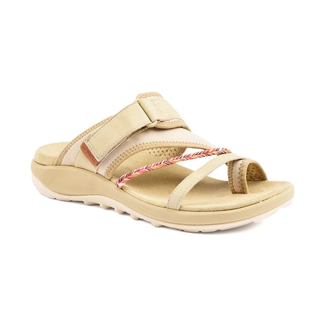 Discover the TERRAN 4 POST Sandals from Merrell, ideal for summer days. These flat sandals are designed for optimal comfort, with a nubuck leather top and upper and 100% recycled textile. The textile lining guarantees exceptional lightness and breathability. The 100% recycled textile and TPR insoles and outsoles offer remarkable durability and flexibility. Details of these sandals include nubuck leather and textile soles, as well as an adjustable headband and a braided detail on the front band. The ecru color is ideal for summer occasions. The TERRAN 4 POST Sandals are perfect for beach outings, holidays or everyday days. -