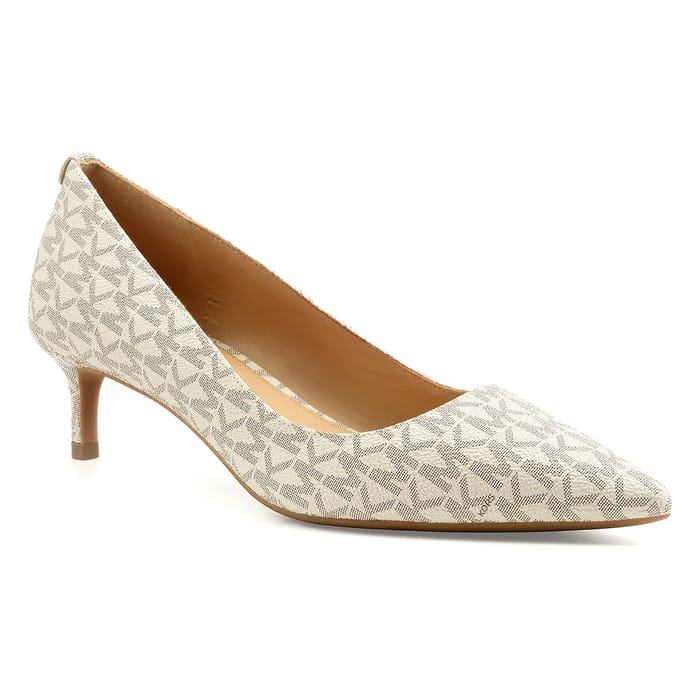 The ALINA FLEX KITTEN pumps from Michael Kors combine chic and elegance in a sleek and elegant design. Made in a synthetic with subtle geometric patterns in ecru and white, these shoes offer a modern and sophisticated look. The synthetic upper is lined with soft leather, ensuring comfort and softness when worn. The leather insole fits the foot perfectly, while the synthetic outsole ensures discreet stability. The 45 mm heel brings a discreet and slender height, ideal for evenings, events or an office outfit. The iconic Michael Kors signature on the sole reinforces their fashion identity signed by a recognized know-how. This model embodies contemporary refinement, perfect for those looking for a touch of timeless style. -