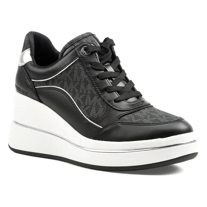 The EMMY WEDGE TRAINER by Michael Kors stands out as a trendy and elegant shoe, perfectly suited for everyday use. Designed in a combination of leather and synthetic materials, this sneaker combines style and comfort thanks to its textured top and white stitching that highlight its neat finish. The leather and synthetic upper offers increased durability, while the textile inner lining ensures a soft and breathable fit. The removable insole allows for personalisation of comfort, and the synthetic outsole, thickened and featuring a tray design, brings stability and lightness. The elegant and structured 70 mm heel adds a discreet touch of height without sacrificing practicality. Available in black, this model fits into the Michael Kors fashion range, ideal for both walking and leisure outings. Its versatile appearance and modern design make it a must-have shoe to complement any everyday outfit. -