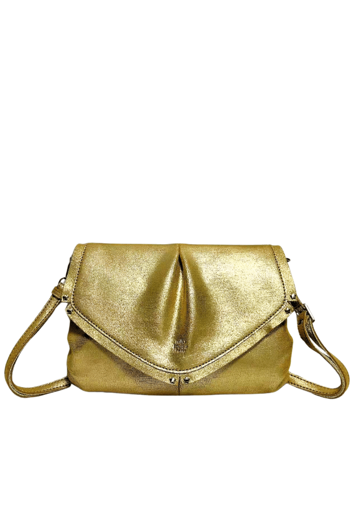 Flap bag LYSE RX from the brand Mila louise, designed in an elegant and classic style. The bag is made of leather for the top and the upper, while the lining is made of polyester. It has a heel of 26 x 17 x 4 cm, ideal for storing your office accessories, your outings or your daily life. The flap bag offers effective security and storage, making it an essential accessory for formal occasions or for an evening out in the city. The gold color highlights the elegance of this bag, which can be worn elegantly on the shoulder or shoulder straps thanks to its two thin straps attached to the sides. The stitching details visible along the edges of the flap and base add to its structured design. A small logo is inlaid near the bottom center of the front panel, although the brand name is not clearly legible in the image. -