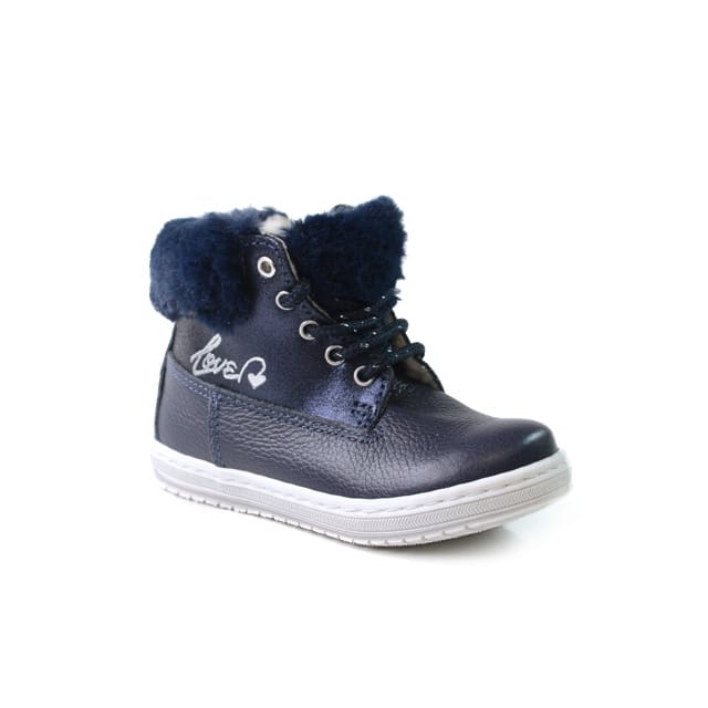 The Agata ankle boots from the Mkids brand are designed for your child's first steps. These navy leather ankle boots feature a synthetic wool lining to keep feet warm and comfortable. The warm textile insole ensures optimal insulation. The rubber outsole offers solid protection. The laces are fixed by silver eyelets. A "Love" message with a heart is engraved on the side of the boot. The Agata ankle boots are an ideal choice for little boys who learn to walk. -