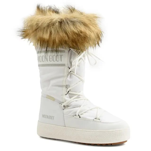 The MB LTRACK MONACO WP warm ankle boots from the brand Moon Boot are designed for general and everyday use. These versatile and comfortable ankle boots are perfect for cold days. Their upper and stem are made of textile and synthetic, while the lining is made of warm textile to maintain heat. The insole is also made of warm textile for a comfortable feel. The outsole is made of rubber, offering durability and wear resistance. The MB LTRACK MONACO WP ankle boots are available in white and feature a zipper with metal buckles to hold the laces in place. A small leather label near the heel carries the additional brand marking information. -