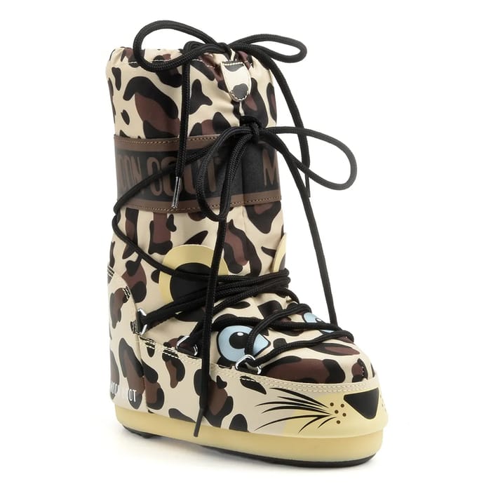 The warm MB ICON ANIMAL ankle boots from Moonboot combine style and comfort for a chic and versatile look. Crafted from a blend of textile and synthetic materials, they offer a strong hold thanks to their structured upper and black lace-up closure via silver eyelets. An integrated elastic band at the top of the boot ensures a close fit and better stability. The synthetic foam lining as well as the foam insole ensure optimal comfort throughout the day. The rubber sole brings durability and lightness, while the multi-coloured design highlights a leopard pattern in cream, brown and black tones, enhanced by a graphic face on the forehead with blue eyes with white highlights and drawn whiskers. The text "MOON BOOT" is engraved around the ankle, adding a recognizable identity touch. This model is suitable for general and everyday use, ideal for facing winter cold weather with elegance. -