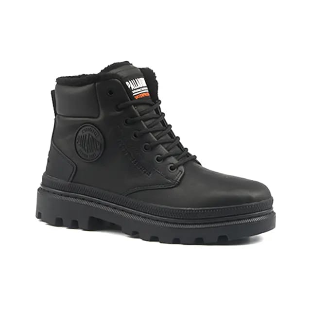 The Pallatrooper SC WPS ankle boots from the brand Palladium are designed for general and everyday use. They feature waterproof and durable leather, as well as a warm textile lining to keep feet warm. The textile insoles are removable and easily washable. The heels measure 35 mm and are equipped with a sturdy rubber sole. The ankle boots also feature a warm textile lining to keep the feet warm. The leather laces are adjustable and the ankle boots are equipped with a heel with a handle for easy setting and exit. The design details, such as the reinforced seams and warm lining, suggest durability suitable for outdoor use or activities. The ankle boots are available in black and are designed for versatile use. -