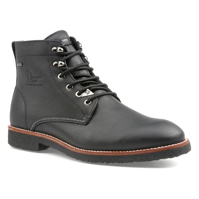 The Glasgow GTX ankle boots from the Panama Jack brand offer a chic and versatile style perfect for everyday use. Designed for comfort and durability, they fit all types of runs. The bold leather top ensures optimal support and an immediate comfort feeling. The Gore-Tex-based textile lining ensures good ventilation while maintaining moisture inside. The removable textile insole makes cleaning and maintenance easy. The rubber sole offers good grip on various floors. These ankle boots, with elegant details such as the stitching visible on the upper and sole, are part of a solid product range and urban adventure. They are distinguished by their elegant design, with a slightly raised heel, a round toe and metal eyelets. An embossed logo is printed on the side and the text "Panama Jack Made in Spain" is visible. The black laces are fixed through all eyelets to ensure a secure closure. A small triangular label on a carnation indicates size or brand information. All this is part of an approach to shoes designed to be durable, comfortable and stylish. -
