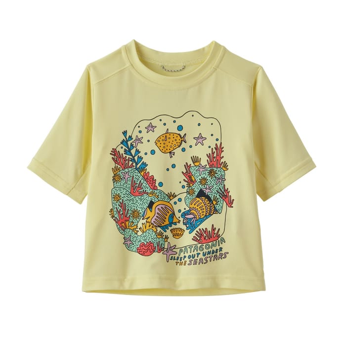 T-shirt for baby "Baby Cap Cool Daily" of the brand Patagonia. This casual t-shirt is designed for everyday wear, for leisure or at work. It is made of 94% polyester, 35% recycled, and 6% elastane. The fabric is breathable and comfortable, ideal for outdoor activities. The anti-UV t-shirt protects the skin of your little ones from UV rays. The colorful and cheerful design depicts an underwater scene with fish, starfish and other marine creatures in shades of blue, red, green, orange and purple. The text "Patagonia Sleep Out Under The Seastars" is inscribed below the illustration. The t-shirt has a knitted collar and is designed for a comfortable and versatile wearing. -