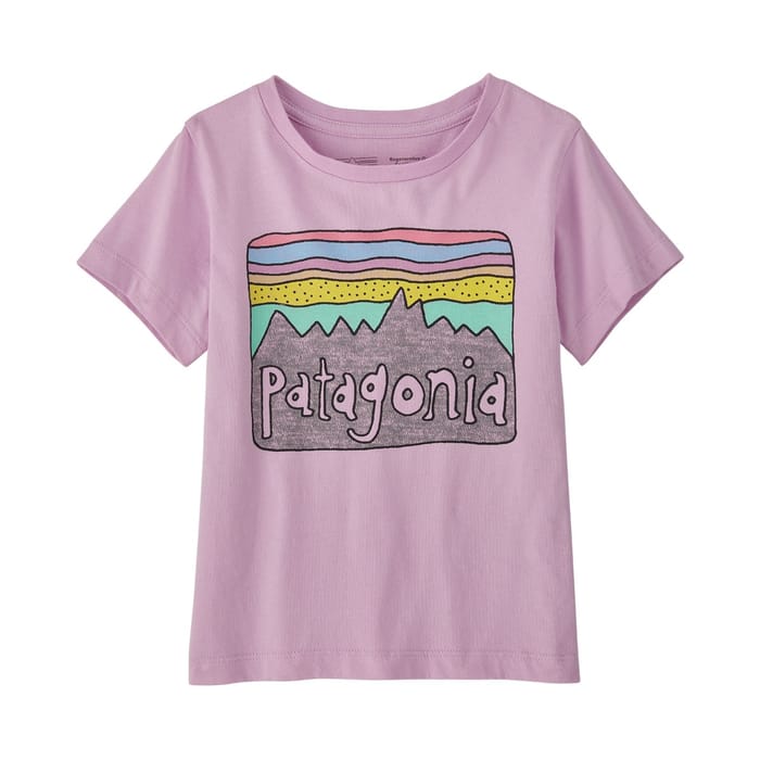 T-shirt for baby Patagonia, certified Regenerative Organic Certified Cotton. This casual and basic t-shirt is designed for everyday activities, leisure and even for work. It is made of 100% organic cotton, offering breathability and optimal comfort. The pink color is beautiful and will perfectly suit your little one. The colorful and dynamic design, with stylized letters "Patagonia" and superimposed geological strata, add a trendy touch to this t-shirt. The round neckline and soft texture of the fabric make it an ideal choice for outdoor activities or for a casual look. The technical, responsible and durable models of Patagonia are the perfect pieces for trendy and engaged looks. -