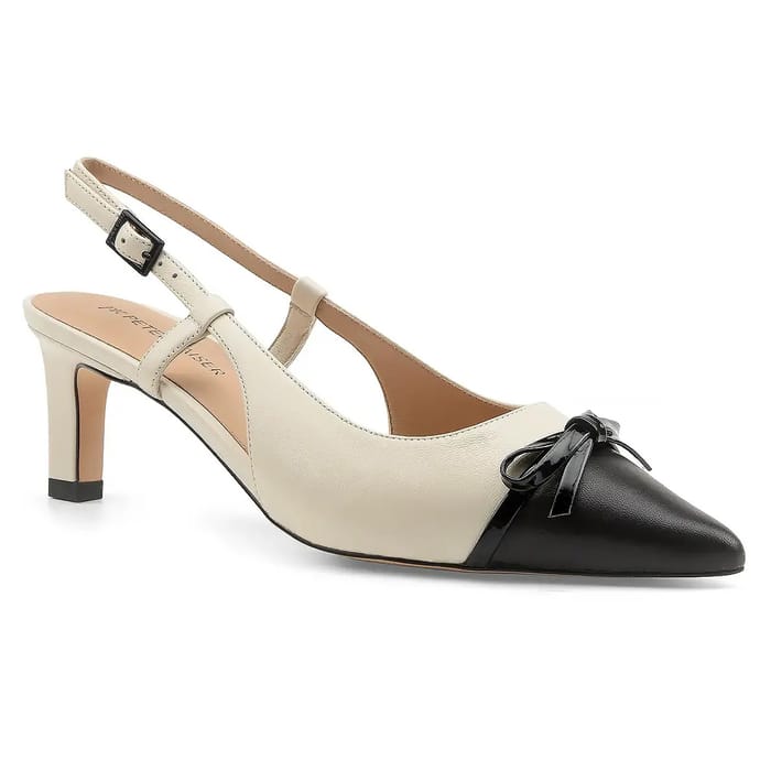 These Ibiza pumps from the Peter Kaiser brand combine timeless elegance with modern sophistication to enhance every occasion. Designed in a slingback style, they gracefully espouse the silhouette while offering stylish comfort thanks to their soft leather insole. The upper and lining, entirely made of leather, guarantee exceptional durability and a luxurious touch, while the synthetic sole ensures stability and lightness for fluid steps. The multicolored design, playing on shades of cream and black, brings a bold and timeless touch, perfect for stylish evenings, business events or an office day. A small decorative knot delicately adorns the front of the model, adding a feminine and sophisticated note. The 60 mm heel, both slender and stable, enhances the silhouette without sacrificing comfort, while the adjustable leather strap, secured by a metal buckle, allows for perfect support. Ideal for those looking for a balance between style and practicality, this model embodies the chic and elegant spirit of the Peter Kaiser brand, where every detail is designed to combine elegance and modernity. -