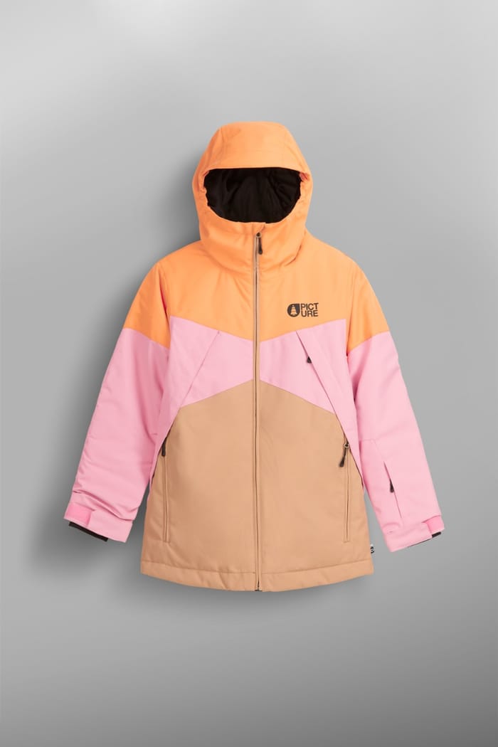 The K's SEADY JKT ski jacket from the brand Picture is a functional and technical outfit designed for outdoor activities in winter. This track jacket is made of 52% recycled polyester and 48% polyester, offering a combination of durability and performance. The multicolored color of the jacket is characterized by an orange top that comes in pink for the sleeves and the lower front part, while the lower back part is beige. The jacket features a full-length zipper along the center, two zipped pockets at the waist and adjustable sleeves with Velcro stripes. A Picture brand logo can be seen on the left chest, above the zipper line. The inside of the jacket is in black, offering a visual contrast with the bright colors of the outside. This ski jacket is designed to offer protection from cold and rain, while being comfortable and easy to wear. -