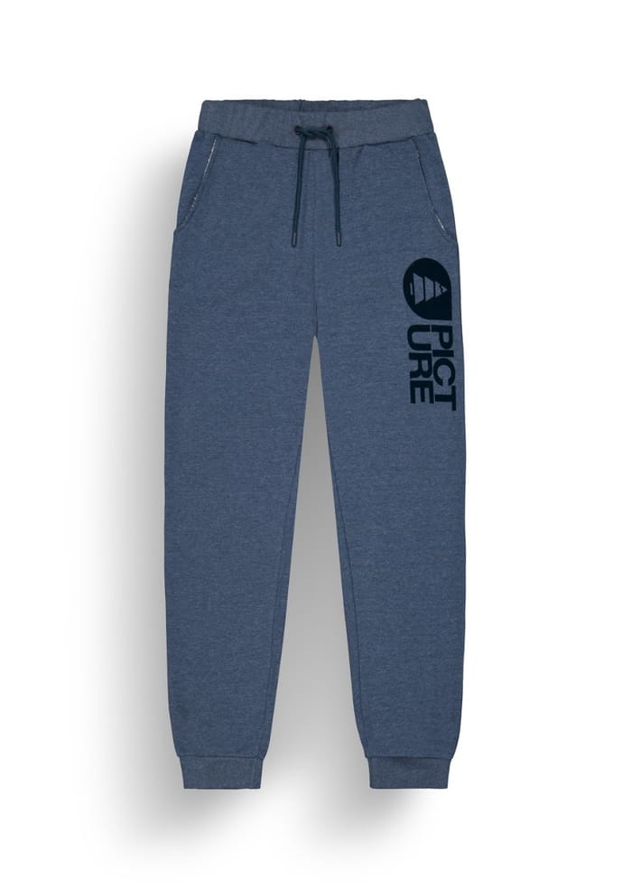 The Picture M's CHILL PANTS are versatile and classic pants designed to accompany your daily activities. Made from 75% organic cotton and 25% recycled polyester, these pants offer optimal comfort while being durable. Their style of pants is simple and elegant, with side pockets at each side near the hip. The blue pants are embellished with an embroidered logo on the left leg, composed of letters "PICTURE" in capital letters and a stylized element resembling mountains or peaks within a circle. A cord at the waistband and elastic bands at the ankles complete this functional design. -