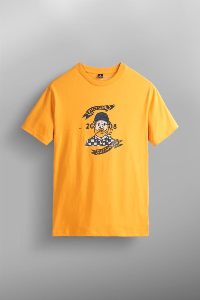 The T-shirt M's CHUCHIE TEE, signed Picture, is a casual basic item designed for everyday occasions, leisure or work. This short-sleeved t-shirt is made of 100% organic cotton, offering breathability and optimal comfort. The bright yellow color and the organic cotton upper contribute to perfect versatility. The T-shirt M's CHUCHIE TEE sports a graphic design on the front, depicting a man with long hair and glasses, topped with a hat, with the text "PICTURE" above and "OUTDOOR LTD." below. A damé pattern is embedded around the neck of the silhouette, while the year "2008" is displayed in capital letters in the middle of the design. -