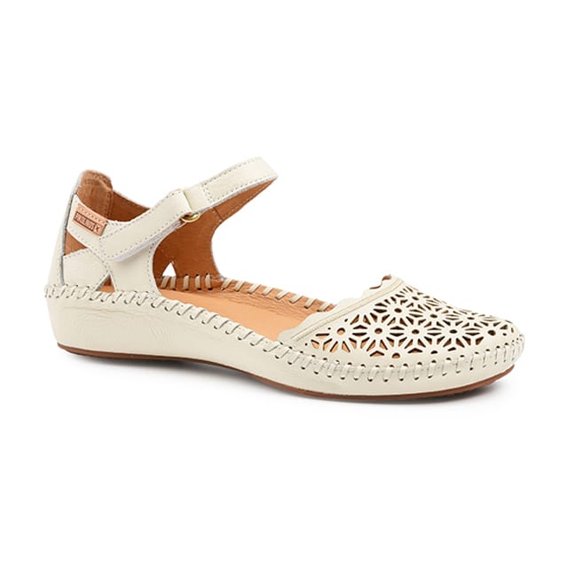 The Puerta Vallarta ballet shoes from the Pikolinos brand combine elegance and comfort in everyday life. Crafted from soft, quality leather, these shoes feature an original design with delicate floral perforations that bring a touch of sophistication while ensuring good ventilation. The ecru appearance brings a chic and casual note, ideal for everyday outings or professional outfits in all lightness. The leather entrechat, light cream in color, offers optimal comfort all day, while the rubber sole ensures good stability and increased durability. A metal buckle flange adds a structured and functional touch, perfect for versatile use. These ballet flats are part of the casual and chic range of Pikolinos, combining originality, quality of leather and well-being at the port. -