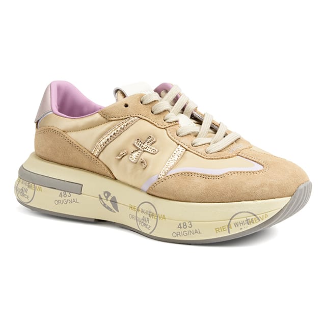 The CASSIE sneakers from the Premiata brand are designed for fashion lovers who want to stay in shape while being comfortable. These trendy shoes feature a textile suede upper and upper, providing a feeling of softness and lightness. Their leather and synthetic lining ensures optimal protection and durability. The leather insoles are removable, thus facilitating the maintenance of the shoes. The synthetic outsoles offer exceptional strength and flexibility. The heels measure 40 mm, offering an ideal height for everyday activities. The details of these sneakers include a touch of luxury with golden accents on the side panels and the back of the heel. The white laces complete the set. The interiors of these shoes offer a touch of color with a pink-purple lining that contrasts with the outdoor color palette dominated by beige. The grey outsoles are designed to offer exceptional versatility and flexibility. The CASSIE sneakers from the Premiata brand are ideal for everyday activities, walking and leisure. -