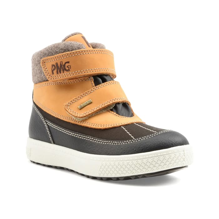 The Barth snow boots from the Primigi brand are designed for winter outdoor activities. They combine nubuck leather, leather and textile to offer optimal sturdiness and functionality. The warm textile lining and warm textile insole ensure consistent comfort and warmth. The rubber outsole provides good weather protection. The Barth boots are waterproof thanks to Gore-Tex technology, making them ideal for snow rides. The nubuck leather and leather used for boot design provide durability and water resistance. The two Velcro bands, one with the "PMG" inscription on a light brown leather background and the other with the Gore-Tex logo, make it easy to fit and provide extra security. The Barth boots are available in a single color, cognac, which harmonizes perfectly with the natural tones of snow. -