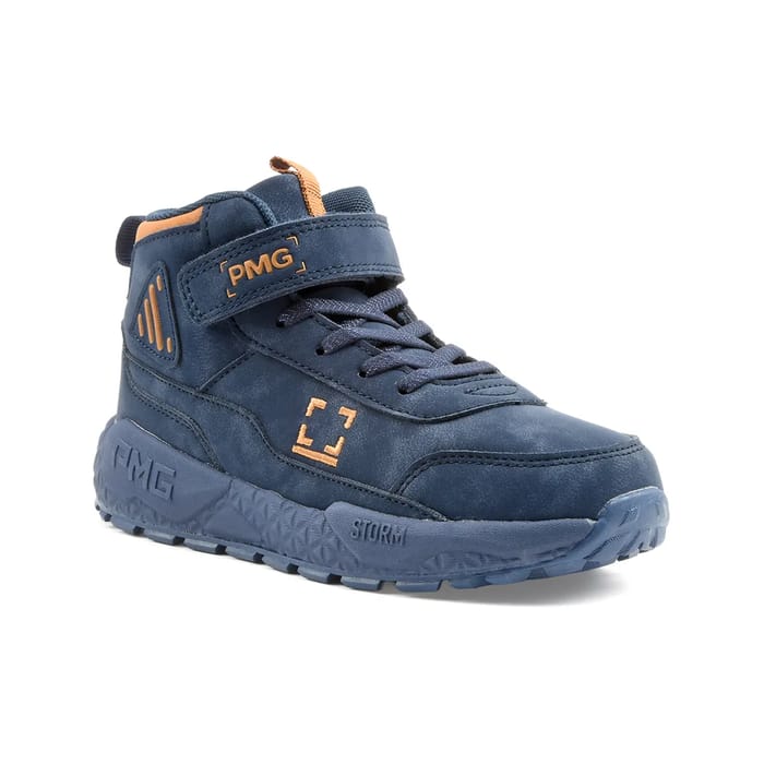 The Billou ankle boots from the brand Primigi are designed for everyday use, casual and elegant. These city ankle boots are made of synthetic, with a textile lining for optimal softness and lightness. The top is synthetic, while the insole is removable leather, providing extra protection and flexibility. The outsole is made of rubber, ideal for outings or outdoor activities, thanks to its deep threads and adapted to rough terrain. The Billou ankle boots feature an elegant style, with orange accents that contrast with the dark blue color of the suede upper sole. The brand name, "PMG", is visible on the tongue that crosses the top of the foot, near the collar, and on the side panel, in an abstract design. The closure laces are complemented by Velcro bands for a secure closure around the foot joint. The Billou ankle boots offer an excellent balance between comfort, style and protection, due to their neat design and quality materials. They are perfect for outings, outdoor activities or everyday use, while preserving an elegant and casual style. -