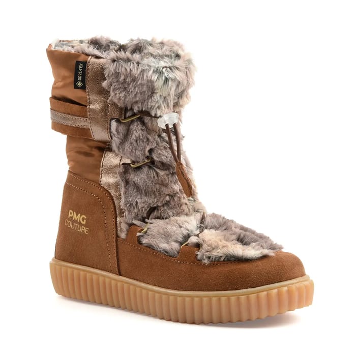 The warm boots Marmotte B of the brand Primigi combine style and functionality to face winter conditions. Designed for outdoor snow activities, they offer lasting warmth thanks to their warm textile lining and the soft light grey faux fur lining that surrounds the inside of the stem. The textile suede top perfectly fits the foot while resistant to weathering. A Velcro strap closure and a golden metal buckle provide optimal fit comfort. The resilient rubber sole ensures solid stability on rough terrain. Featuring an integrated waterproof system, these snow boots in beige stand out as a robust and functional choice for the winter. The “PMG Couture” emblem in golden letters on the heel completes their elegant and distinctive look. -