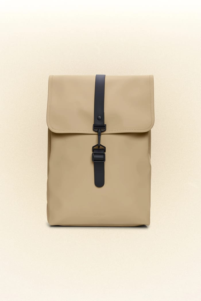 Rucksack Rains, functional and versatile backpack style. Designed for everyday activities, this backpack is perfect for work, study and hiking. It is made of 100% polyester with polyurethane coating for optimal durability. The lining is also made of 100% polyester for added strength and flexibility. This backpack features a minimalist design with black bands and clasps that add a touch of style. The flap closure is secured by two black adjustable strips that attach to the front thanks to plastic clasps. The seams visible along the edges of the bag reinforce its strength. The beige color of the backpack creates a harmonious and discreet look. A Rains logo is embossed near the bottom center of the flap closure, adding a personal touch to this versatile backpack. The Rains backpack is an ideal choice for those looking for practical and durable transport equipment.