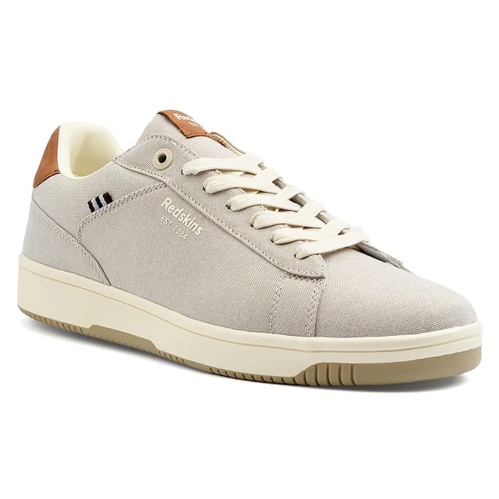 The Redskins Guran are versatile lace-up shoes designed for office occasions, outings and everyday wear. They feature a textile top and upper, providing a comfortable fit and durability. The inner lining is also made of textile, while the insole is removable. The outsole is made of rubber, offering solid protection. The Guran shoes are available in grey, a classic color that suits many occasions. Details of these shoes include a textile sneaker and white laces. The Redskins logo is printed in light grey along the side of the shoe, near the shoelace area. A small logo composed of three colored stripes (black, red and blue) is visible above the text. -