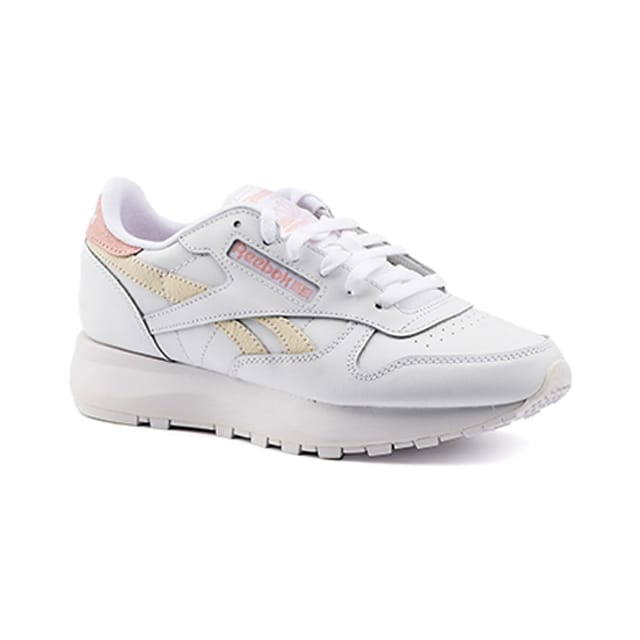 Low sneakers Reebok CLASSIC LEATHER SP, classic style, designed for lovers of fashion and comfort. These leather and synthetic shoes feature a leather top and upper, while the lining is made of textile. The insole is also made of textile and the outsole is made of rubber. Shoe details include white laces, perforations for better ventilation near the heel area and a cushioned heel for a comfortable walk. Discreet pink accents surround the collar of the shoe, adding a touch of sophistication. The main color is white, making it an ideal choice for fashion lovers who want a pair of classic and versatile shoes. -