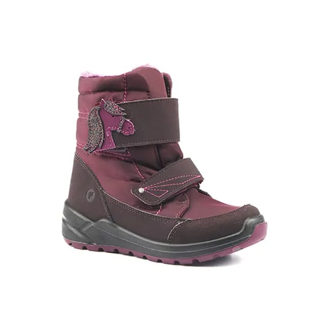 The Warm booties Garei from Ricosta are designed to offer exceptional comfort and durability. These high-top children's ankle boots feature a warm textile lining and a warm textile insole to keep feet warm in cold conditions. The top and upper are made of synthetic and textile, offering a combination of strength and flexibility. The outsole is made of rubber, ensuring optimal durability and protection. The details of these ankle boots are carefully designed to offer a functional appearance and an attractive style. The synthetic and textile snow boot adds a touch of personality, while the two adjustable Velcro bands ensure a secure fit. The embroidered pink and green horse appliqué on the top band adds a touch of style, while the pink stitching details on the stitching add a touch of finesse. The Warm booties Garei from Ricosta are available in a pretty burgundy color that perfectly matches the dark tones of the skin. These ankle boots are designed for general and everyday use, offering exceptional comfort and durability for children. -