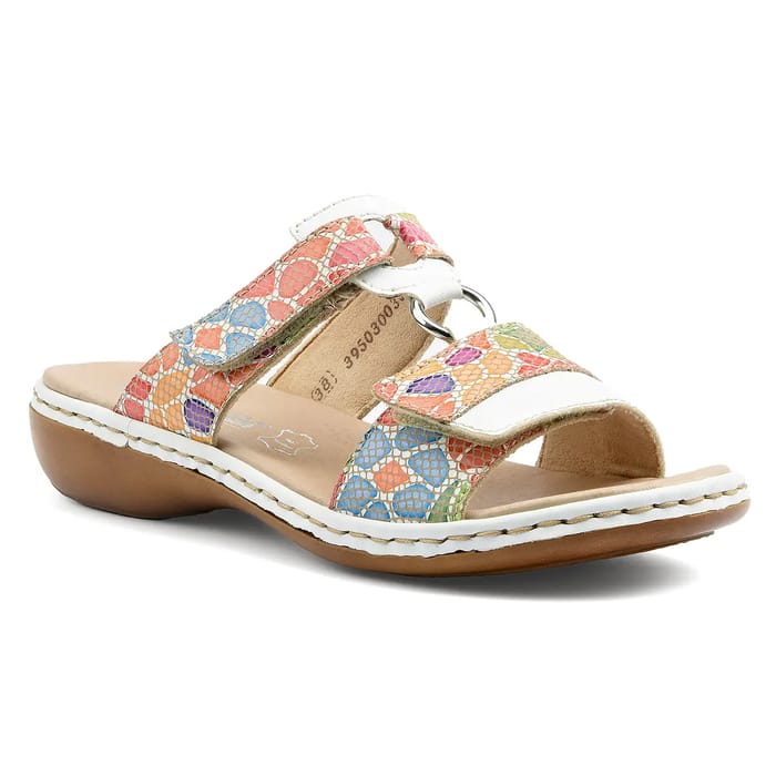 Discover the mule Rieker 659X6, a casual and comfortable model for outings and everyday. This shoe is designed to offer a unique feeling of comfort, with a textile lining and leather insole. The top and upper are made of synthetic and leather, offering a combination of flexibility and durability. The sole is made of synthetic, ensuring lightness and ease of wearing. The mule 659X6 is available in multicolor, with colorful geometric patterns on the tongue, in orange, blue, purple and green, as well as white accents. The front buckle closure allows for easy adjustability. This shoe is ideal for summer, with a 25 mm heel and a synthetic sole for a feeling of comfort and lightness. The Rieker 659X6 mule is a perfect choice for outings and everyday life, offering a combination of comfort, fashion and flexibility. -