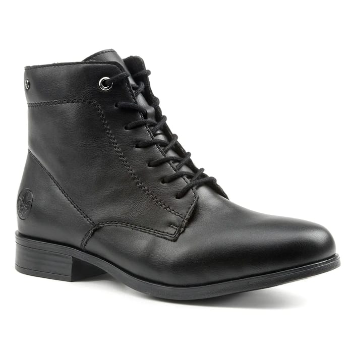 The Arbela ankle boots from the brand Rieker are designed for cold autumns and winters. These sturdy and casual ankle boots are ideal for outdoor activities and work. Their synthetic top is lightweight and flexible, providing optimal comfort while protecting the feet from the weather. The warm textile lining ensures optimal insulation, while the warm and removable textile insole can be replaced when needed. The rubber sole offers solid protection and good support. The Arbela ankle boots feature black laces and metal buttons for laces, as well as stitching details visible along the seams. A small Rieker logo is also embossed on the side, near the back of the boot. The Arbela ankle boots are available in black, with a 25 mm heel and a round heel design. -