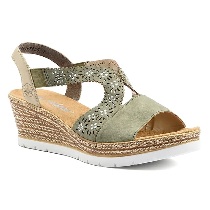 The sandals Pavona of the brand Rieker are designed for women who seek elegant style and absolute comfort. These synthetic wedge sandals feature a synthetic top and lining, as well as a textile insole. The heel measures 55 mm, offering a nice height without compromising stability. The khaki color is ideal for summer outings or evenings in summer. The synthetic sandal details and rhinestone ornaments add a touch of sophistication. The Pavona sandals from Rieker combine style, comfort and stability, making them perfect for summer occasions. -