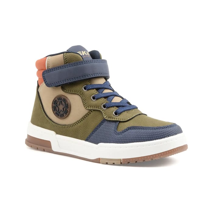 The Ironton ankle boot from the brand Sk8 combines elegance and comfort for everyday use. Featuring a synthetic top, it showcases a casual and elegant design with varied olive and navy tones. The textile lining ensures increased comfort, while a leather insole and rubber outsole provide good protection and support. The lace adjustment in navy blue allows a good adaptation to the foot. A circular emblem with the SKE text is visible near the ankle, and orange details on the collar add a vivid contrast. This ankle boot is ideal for commutes, outings or any common use, offering a modern and functional style. -