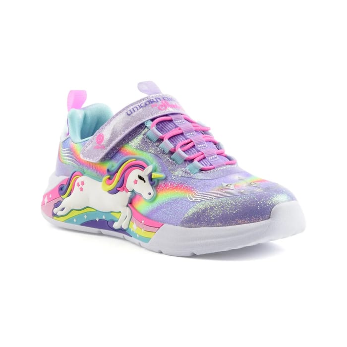 The Velcro sneakers UNICORN CHASER from Skechers are designed for kids who love magical adventures. These casual and practical shoes are perfect for leisure and easy mobility. Their multicolored synthetic top, with rainbow accents and a 3D appliqué of a unicorn, is both vivid and captivating. The pink laces and the Velcro tongue ensure an easy and fast fit. The white rubber sole is adorned with pastel details, such as stars and stripes, which add a touch of fantasy. The UNICORN CHASER shoes are designed to offer exceptional comfort while being versatile and easy to wear. -