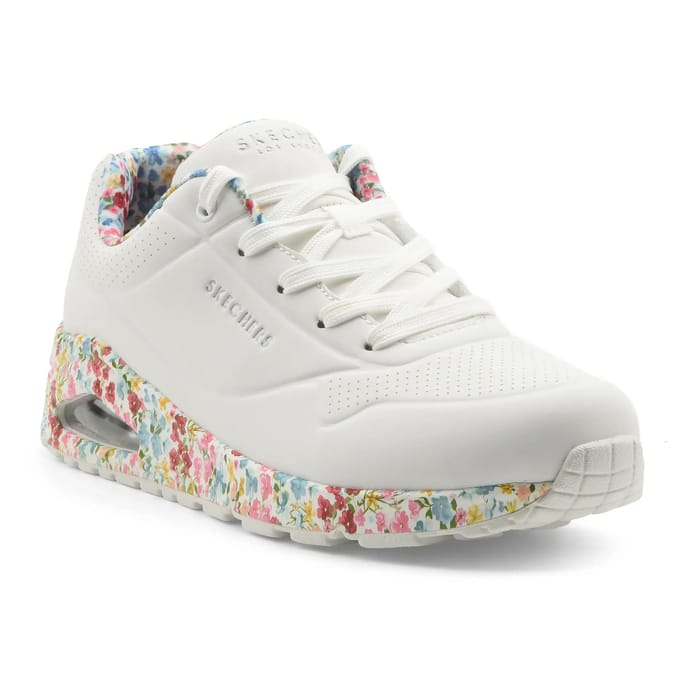 The Skechers UNO MAJESTIC GARDEN embodies the perfect combination of style and everyday comfort. These sneakers, designed to fit any occasion, combine a trendy design with a neat manufacturing. Their lightweight synthetic upper and rubber sole provide optimal stability, ideal for walking or leisure. The textile interior, embellished with a colourful floral pattern with vibrant hues, brings a touch of originality and softness, while the textile insole enhances well-being with every step. The all-white model stands out for its synthetic sneaker details and understated branding, reflecting the timeless elegance of the Skechers brand. Perfect for versatile use, these sneakers combine performance and aesthetics to enhance every moment. -