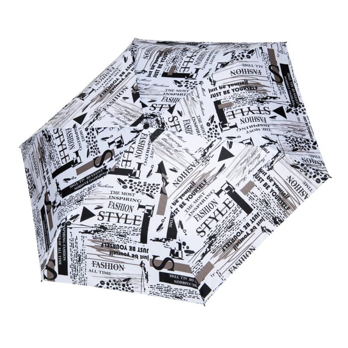 The MAGIC MATIC SLIM umbrella from the brand Strotz is a practical and functional accessory for everyday trips. Designed to offer effective rain protection, it features an automatic opening and closing for easy operation. The original design of this umbrella is characterized by a white background on which are printed texts and graphics in black, inspired by fashion. Phrases such as "FASHION STYLE" and "JUST BE YOURSELF" are repeated in different fonts, sizes and orientations, creating a dynamic visual effect. Graphic elements such as lines, shapes and small illustrations complete the texts, adding a touch of creativity to the design. The MAGIC MATIC SLIM umbrella also features a synthetic upper and top, providing durability and lightness appreciated for everyday travel. -