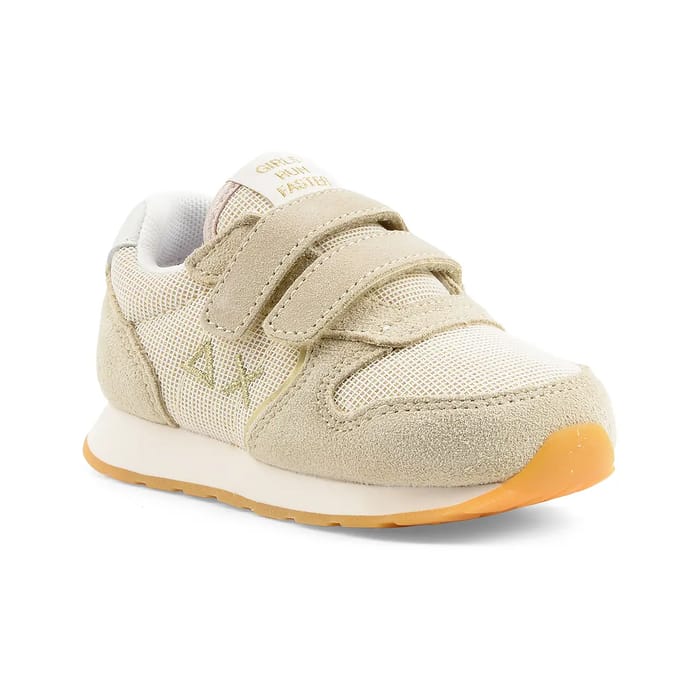 The Sun68 Girl's Ally are Velcro sneakers designed especially for young girls, combining style and practicality every day. Their textile suede upper, soft and durable, is enhanced with velvet leather details around the forefoot area and sides, bringing an elegant and durable touch. The textile lining ensures optimal comfort, while the removable insole allows for easy maintenance and a personalized fit. The rubber sole offers good stability for smooth mobility, ideal for everyday activities or leisure. The beige color, subtle and timeless, perfectly matches with a casual wardrobe. A small discreet logo near the heel buttress and the tongue stamped "GIRLS RUN FASTER" reinforce the dynamic identity of this shoe. Perfect for small adventurers, these sneakers combine versatility and comfort for active days without compromise. -