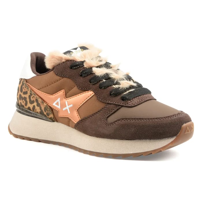 STARGIRL ANIMAL, Low sneakers of the brand Sun68, offers a trendy style and fashion for your daily life. This pair of shoes is designed with a velvet, textile and synthetic leather upper, offering a combination of comfort and versatility. The textile lining adds a touch of finesse to the inside of the shoe. The textile and removable insoles guarantee an optimal adaptation to the foot. The synthetic soles ensure durability and wear resistance. The shoe details include tiger spring accents on the sides, adding a touch of personality to the set. The black laces interspersed with light beige faux fur create an interesting contrast. An orange star-shaped logo with white triangular symbols inside is located near the midfoot area. The thick sole in white and the rubber outsole complete the set. The brown color of the shoe is ideal for lovers of natural colors. The trend and fashion product range of STARGIRL ANIMAL is perfect for people looking to keep up with the latest fashion trends. This pair of shoes is also ideal for everyday activities, walking and leisure. -