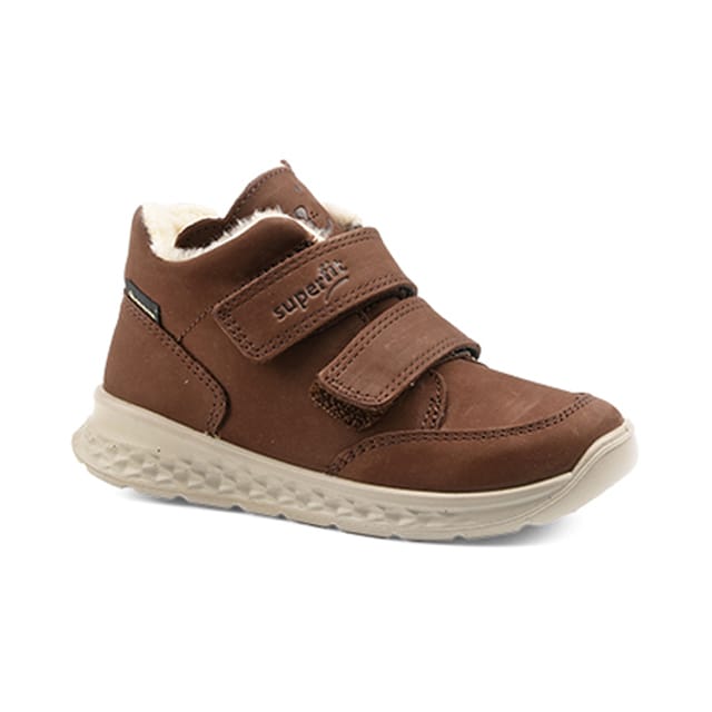 The boot "372" of the brand Superfit is a great choice for your child's first steps. This ankle boot is designed for durability and comfort, with a nubuck top and upper that provide protection from the weather. The interior is lined with a warm textile, while the outer lining is made of Gore-Tex, ensuring optimal insulation and protection from rain. The insole is also made of warm textile, to keep your child's feet warm and comfortable. The outsole is made of rubber, providing strong protection against shocks and impacts. The Superfit "372" ankle boot features nubuck leather first steps boots, with Velcro laces for an easy and fast fit. The brown color is a classic and elegant option that will suit all styles of clothing. The details near the heel add a touch of sophistication to this ankle boot. The combination of Gore-Tex lining, gum sole and warm textile insole makes it an ideal boot for kids who love to explore and play outdoors. -