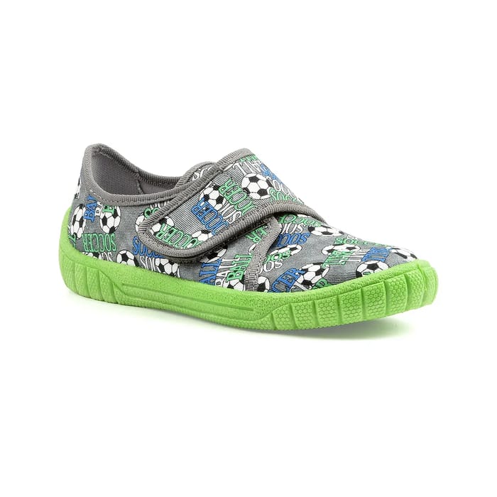 The Superfit slippers offer optimal comfort for moments of relaxation at home, particularly suitable for cold seasons. Designed in a soft textile material, they combine warmth and flexibility for a pleasant all-day wear. The grey fabric top adorned with black and white football motifs adds a modern twist, while the blue details and green text bring a vibrant note. The durable and textured rubber sole ensures discreet stability, ideal for indoor trips. Featuring a scratch closure, they easily adjust for personalized comfort. These functional and comfortable slippers are part of a range designed for everyday well-being. -