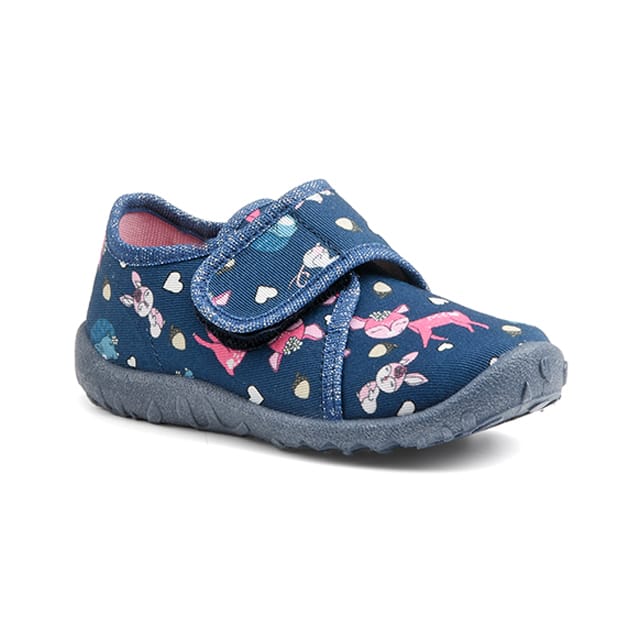 Discover the Slippers Spotty from Superfit, ideal for small winter explorers. These comfortable and functional slippers are designed to offer warmth and softness to children's feet. Their dark blue textile top features cheerful animal prints, such as pink foxes and white rabbits, that will make little ones laugh. An adjustable buckle closure system ensures a good fit, while the light pink textile lining brings a touch of tenderness. The durable rubber soles provide a solid foundation for outdoor adventures. The Slippers Spotty are perfect for relaxing moments at home or for winter outings. -