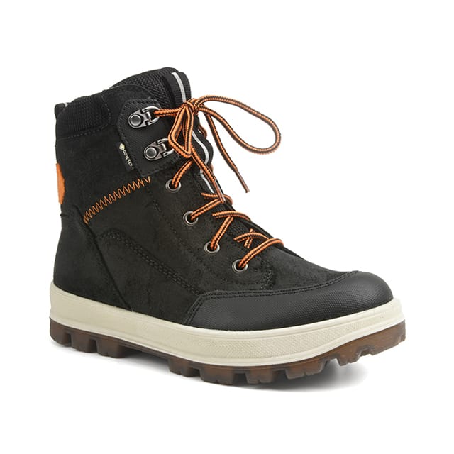 The boots Teoo of the brand Superfit are designed for general and everyday use. They offer exceptional support and comfort thanks to their warm textile lining and warm textile insole. The rubber outsole guarantees durability and resistance to wear. The ankle boots feature a velvet leather upper and Gore-Tex lining for weather protection. The boot details, such as orange laces and metal eyelets, add a touch of style and personality. Teoo ankle boots are available in black and are designed to be versatile and comfortable. They are ideal for hiking or simply for everyday use. -