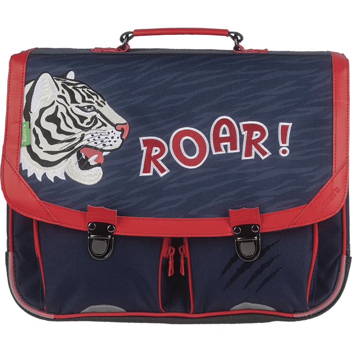The K's Satchel Aaron of the Tann's brand is a versatile backpack designed to meet work, study and hiking needs. It is made of recycled polyester, a durable and environmentally friendly material. This binder measures 38 x 29 x 15 cm and offers excellent storage thanks to its compartments and zipped pockets. Comfort is also ensured thanks to its ergonomic design. The K's Satchel Aaron is available in navy blue, a robust and elegant color that will suit all users. The two black metal clasps that hold the flap of the bag add a touch of strength and professionalism. The "ROAR!" logo in white letters framed in red, as well as the illustration of a tiger on the front of the bag, give a heart stroke to the elegance and personality of this binder. A small green tag is also visible near the upper left corner of the bag, adding a touch of detail and sophistication. The K's Satchel Aaron is an ideal choice for those looking for a functional, versatile and stylish backpack. -