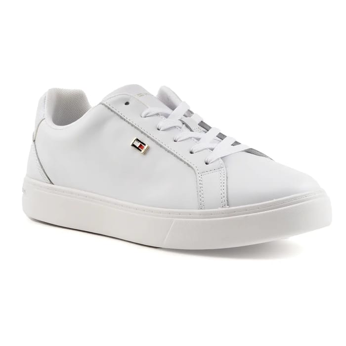 The FLAG COURT SNEAKER Tommy Hilfiger combines elegance and comfort in an iconic model of casual chic fashion. Made of smooth leather, this white sneaker is distinguished by its sober low upper and sleek design, ideal for everyday wear or relaxing outings. A textile lining ensures optimal comfort throughout the day, while the removable insole allows for personalisation of comfort. The rubber sole offers discreet stability and increased durability, complemented by a slightly reinforced upper at the front for better strength. Strategic perforations around the ankle promote ventilation, ensuring good ventilation. The rectangular logo detail in red, black and gold on the back side adds a signature, stylish touch. Perfect for everyday wear, leisure or a casual outing, this shoe is in the timeless lineage of the brand, combining modern style and natural versatility. -