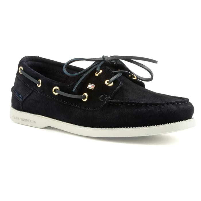 The HILFIGER SUEDE BOAT SHOE by Tommy Hilfiger combines elegance and comfort in a timeless silhouette. Made in a dark blue suede, they are part of the brand's relaxed and chic range, ideal for summer outings or leisure moments. The suede upper combines softness and sturdiness, while the rubber sole offers discreet stability and remarkable lightness. The synthetic interior and leather insole ensure lasting comfort throughout the day. Careful details such as the blue laces, the golden tips of the eyelets and the stitching visible along the edges reinforce the refined character of the model. A discreet flag emblem near the heel and the brand name engraved in grey on the side of the sole add a distinctive touch. This velvet leather boat loafer embodies a chic, sleek and timeless casual style, perfect to complement a casual outfit with a touch of sophistication. -