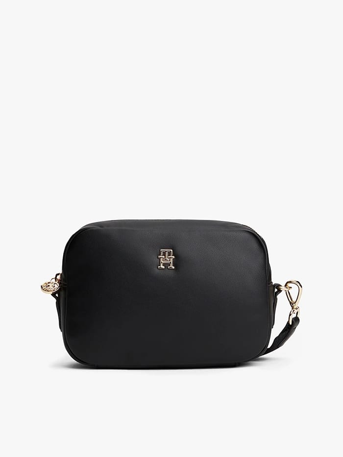 The POPETTE SOFT CAMERA BAG by Tommy Hilfiger embodies a chic and timeless casual style, combining elegance and practicality. This smooth leather shoulder bag, in black color, fits in a range of modern and sleek design. Its recycled cotton lining enhances its responsible character, while its golden metal finishes, including the clasps and emblem on the front, add a stylish touch. The set is enhanced with a decorative charm suspended from one of the loops. The adjustable shoulder strap allows for comfortable portability, suitable for both outings as well as office or travel. Designed to combine safety, ergonomics and functionality, this model combines discretion and elegance in every detail. -