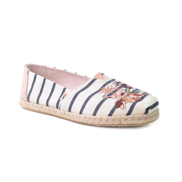 The Espadrilles of Tom's season, The Seasonal Rope Classic, are an ideal choice for hot summer days. These casual shoes are designed for optimal comfort, with a textile top and insole for exceptional lightness and breathability. The textile lining adds an extra touch of comfort. The canvas top features horizontal navy blue stripes, while the tip area is adorned with a floral pattern embroidered in pink, orange and brown. The sole, in braided jute, gives these shoes a casual espadrille look. The ecru color is ideal for holidays or a day at the beach. A small metallic logo is visible on the side, near the opening. The Espadrilles of the Tom's season is perfect for hot summer days. -