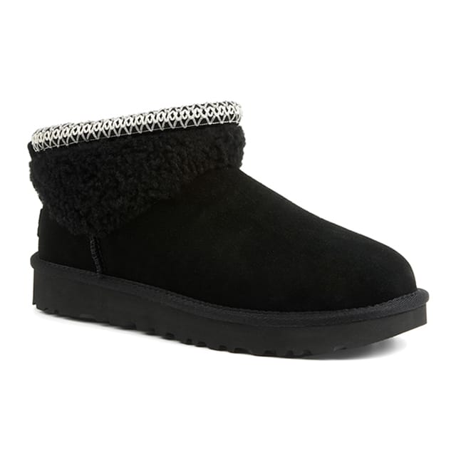 Discover the W Classic Ulrta Mini Maxi Curly ankle boots from UGG, perfect for cold days. These warm ankle boots in turned sheepskin and wool offer unparalleled comfort while being versatile and suitable for everyday use. Their sheep lining and sheep insole guarantee exceptional warmth and softness. The rubber outsole offers durability and wear resistance. Details of the design, such as the opening adorned with a printed pattern visible from the outside, add a touch of style to these ankle boots. The W Classic Ulrta Mini Maxi Curly are available in black, a chic and elegant color that will suit any look. These ankle boots are ideal for cold days, but can also be worn at any time for their comfort and style. -