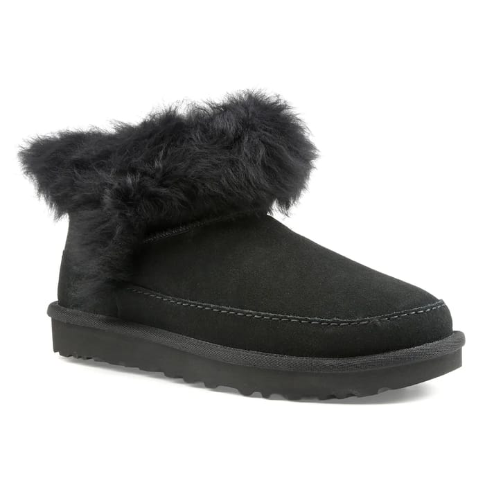 The W Classic Ultra Mini Chalet ankle boots from the UGG brand offer unparalleled comfort thanks to their turned sheepskin upper and sheepskin lining, ensuring a perfect fit and an immediate feeling of softness. Their sheepskin insole and synthetic outsole ensure optimal comfort while ensuring remarkable durability. Designed for everyday use and suitable for use in all seasons, these ankle boots are part of a chic, versatile and comfortable range. Black in color, they highlight an elegant design with a faux fur trim detail slightly floating around the top. Inspired by a modern trend, they combine fashion and functionality to end up in the wardrobes of fashionistas. -