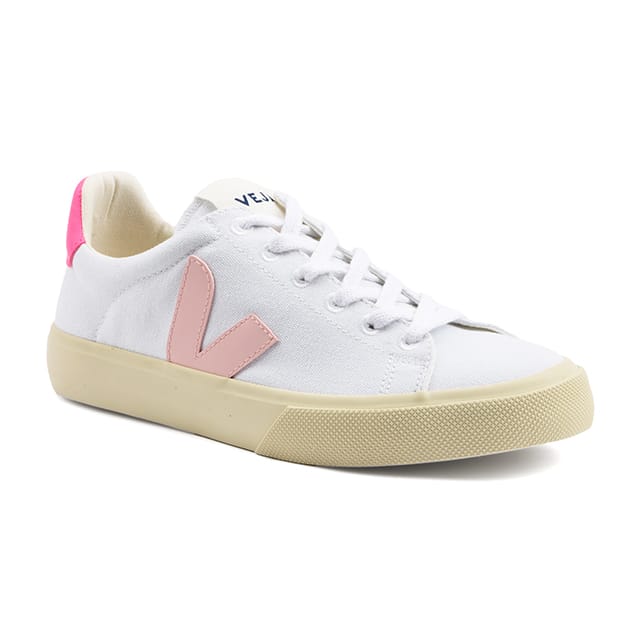 CAMPO CA de Veja: a pair of white canvas sneakers that embodies relaxation and trend. Designed for summer outings, these shoes are ideal for leisure and moments of relaxation. Their removable textile sole ensures optimal comfort throughout the day. Their synthetic rubber sole offers exceptional strength and durability. The white straps and beige textile lining create a pleasant contrast with the cream rubber sole. The small pink touch on the tongue and the pink "V" logo on the side add a fancy touch to these shoes. The Veja brand logo appears on the tongue in blue, recalling the ethical and ecological philosophy of the brand. The CAMPO CA by Veja is a pair of sneakers that combines style, comfort and durability. -